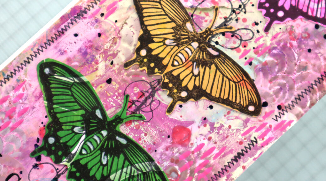 I also decorated the page with some yellow toned butterflies. These were also previously made collage fodder (with Butterflies and Moths stamp set) from my gelli printing sessions. For the text I used black ink and the word free from the Mix It Up 6 stamp set. The word fly is stamped with the A to Z set.