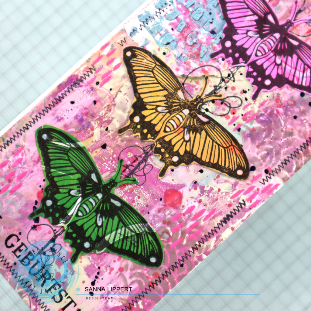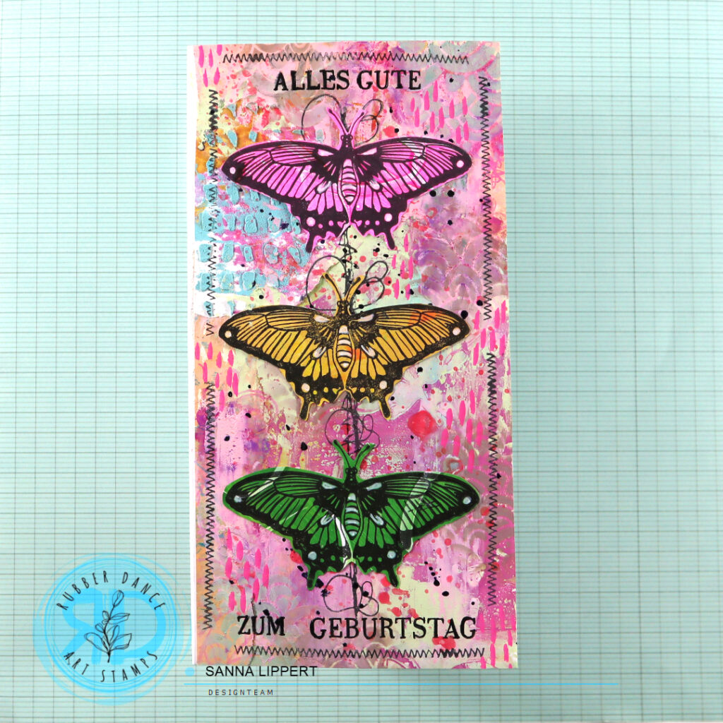 Hello everyone! It´s Sanna here today with another birthday card share. For this card I´ve used Marks 3 and Rainbows 2 stencils with Butterflies and Moths, Kartengrüße and Stitching Borders stamps.