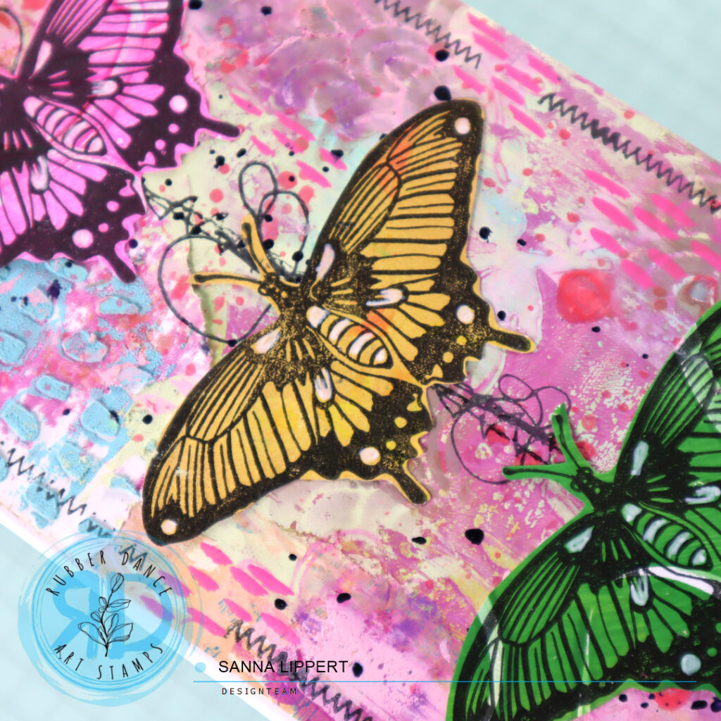 After that I stamped outlining with the Stitching Borders stamp set and a line into the middle with black ink. Then I took some collage butterflies I had made previously and adhered those to the card as a centerpiece. I added some white gel pen details to them and finished the card off with a stamped birthday wish.