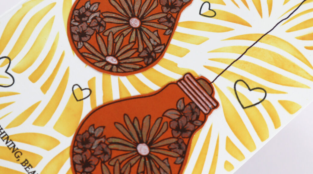 I first added some yellow and orange Distress Oxide Ink thru the stencil onto the white cards background. Next I stamped the light bulbs with black ink onto an orange paper and then added some details with metallic gel pens to them.