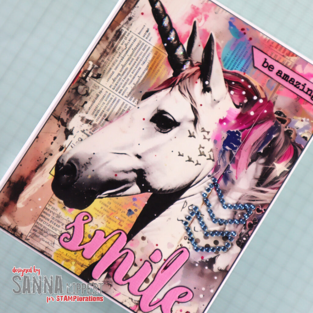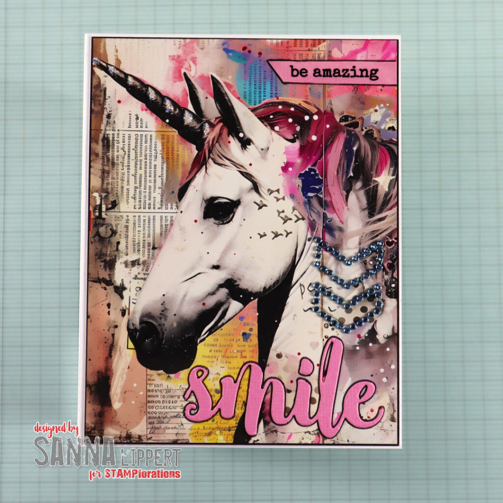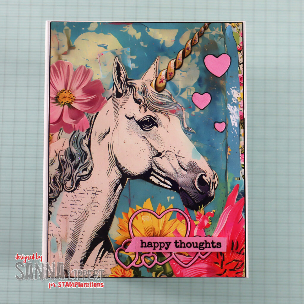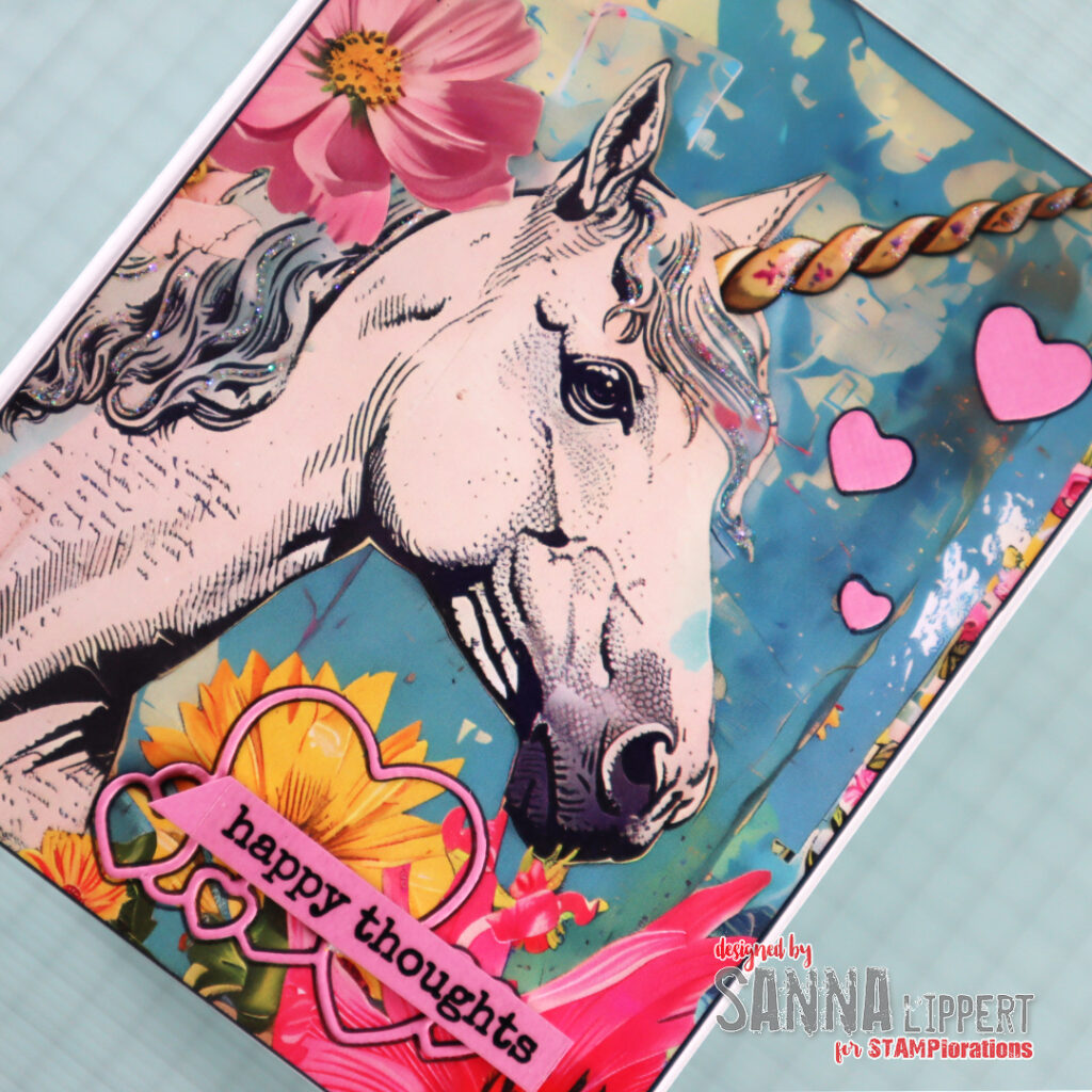 For the above card I´ve used the “Clustered Hearts” die cut die. I´ve saved the smaller hearts and adhered those to the right upper corner of the card. The sentiments is from a clear sticker set called “Shine Bright”. I outlined the hearts to lift them from the background. Also the unicorn has some Stickle details here and there for sparkle.