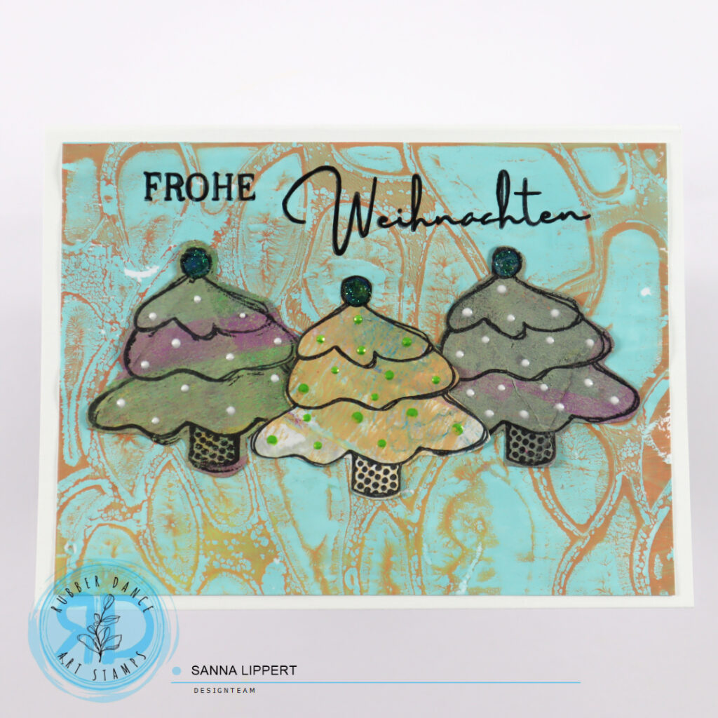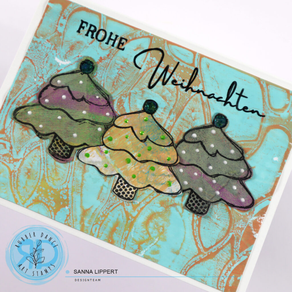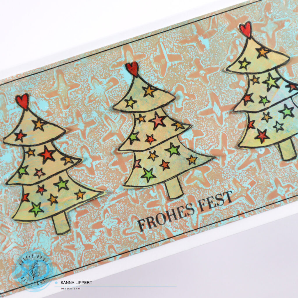 And for the final set I´ve used the Organic 3 and Cross It stencil with a gel plate on the background. The trees (Textured Xmas Trees 2) got stamped onto another gelli printed collage paper and fussy cut. I´ve added some glitter pen details to the slimline card´s trees and the smaller card has some Tonic Studio Nuvo Drops as decor. Sentiments on both were stamped with the Kartengrüße stamp set.
