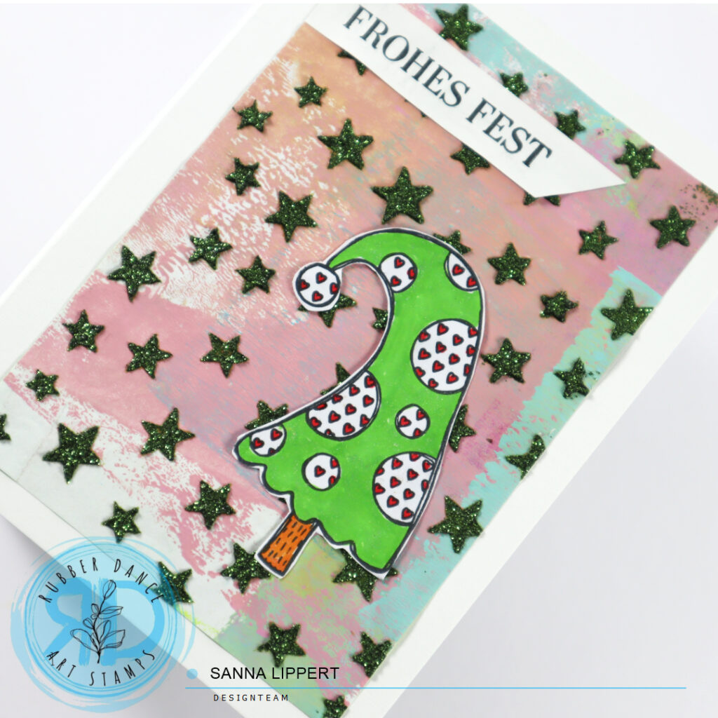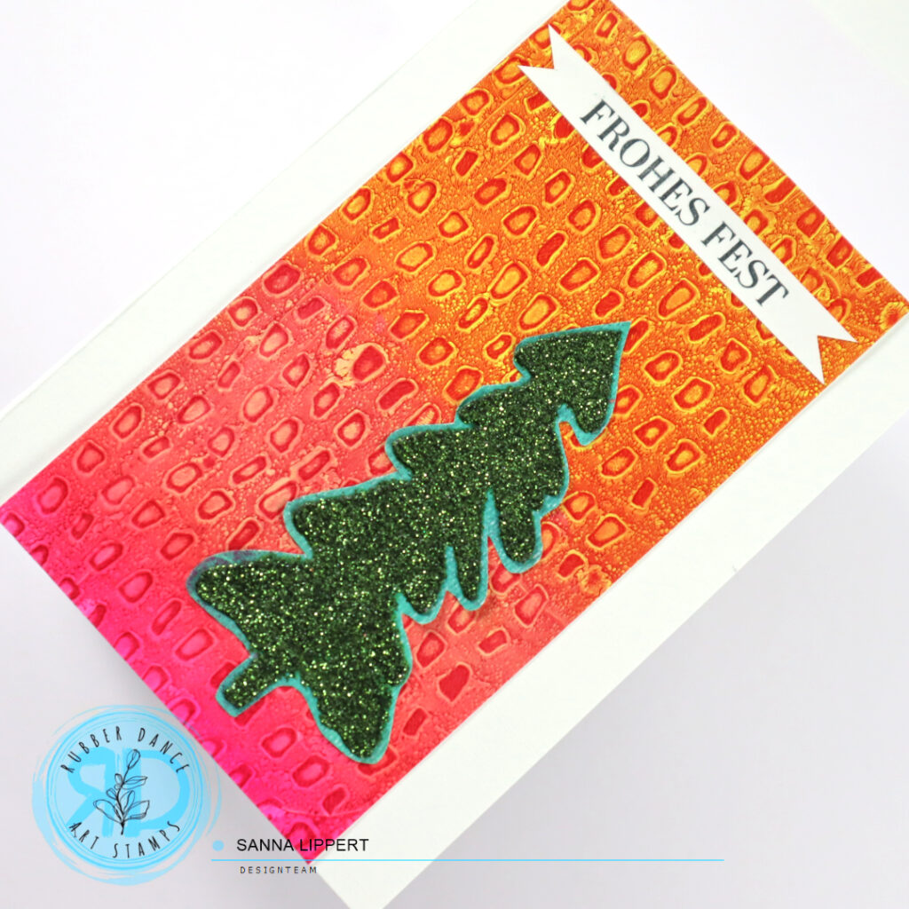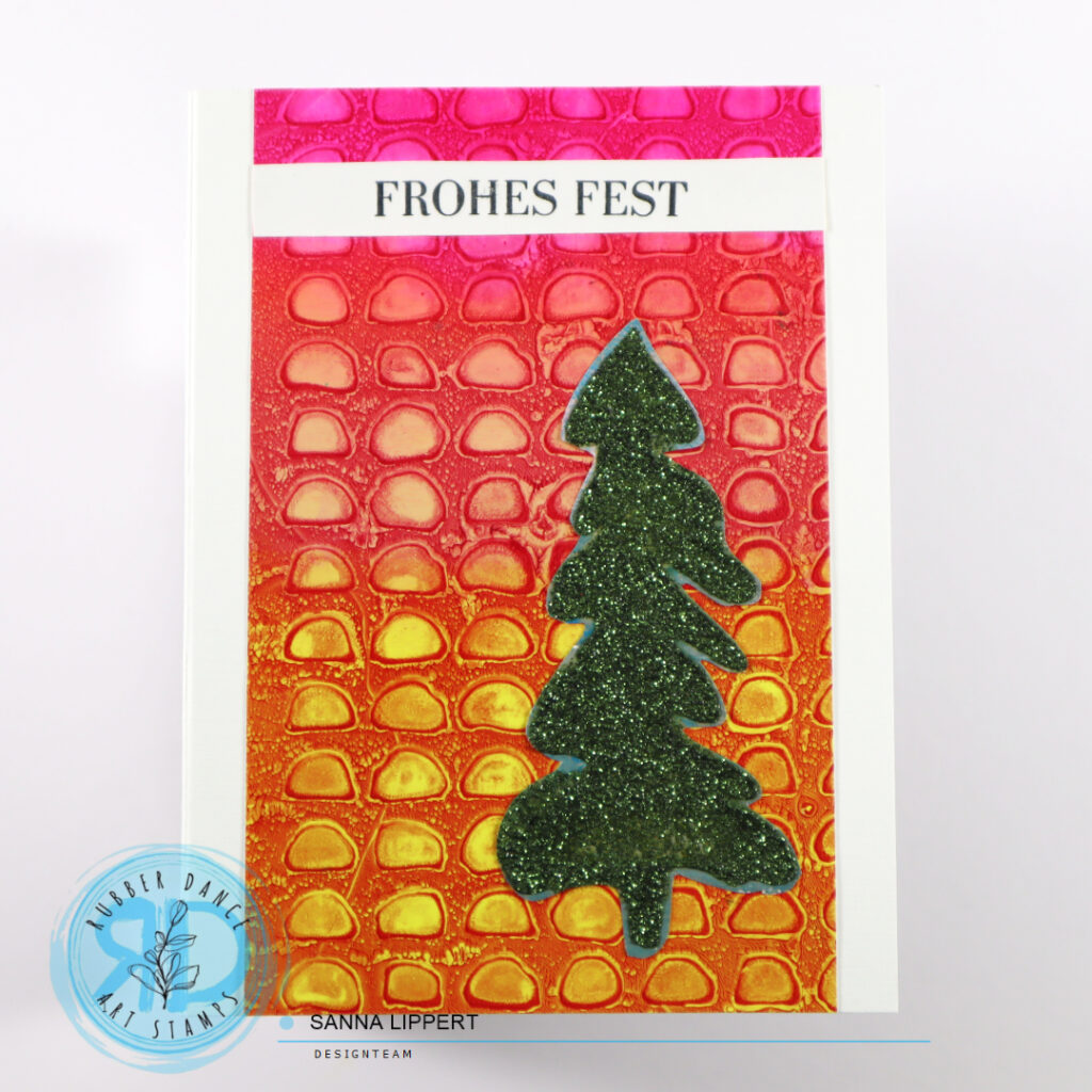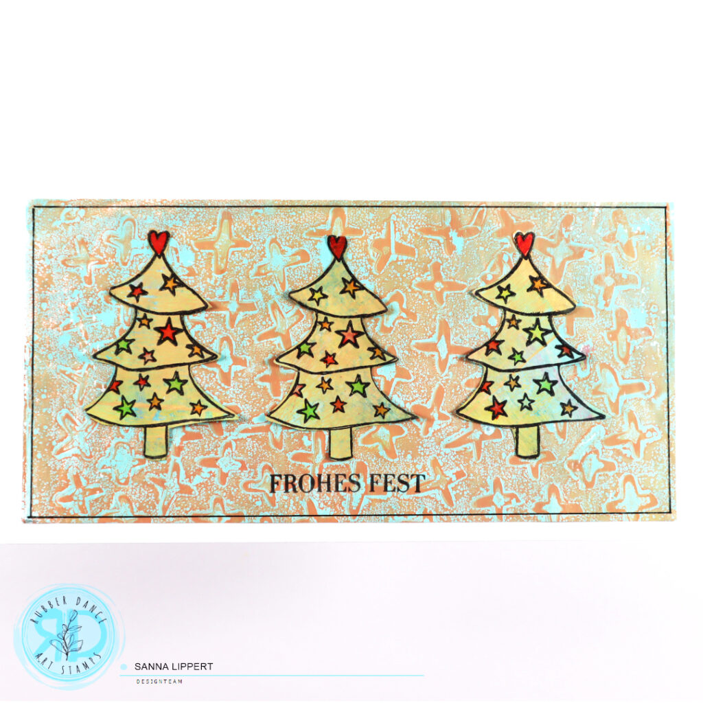 I have a glitter paste stenciled background paper on these cards (made with Tonic Studios paste and Stars 1 Rubber Dance stencil). On top I´ve added some on collage paper stamped (Textured Xmas Trees 2) trees. Finished with Kartengrüße stamp set sentiments. The green tree was stamped on plain paper and then colored with Edding glitter brush pens.