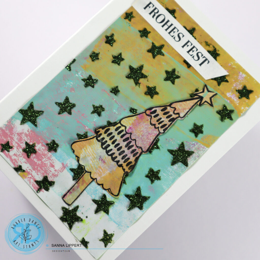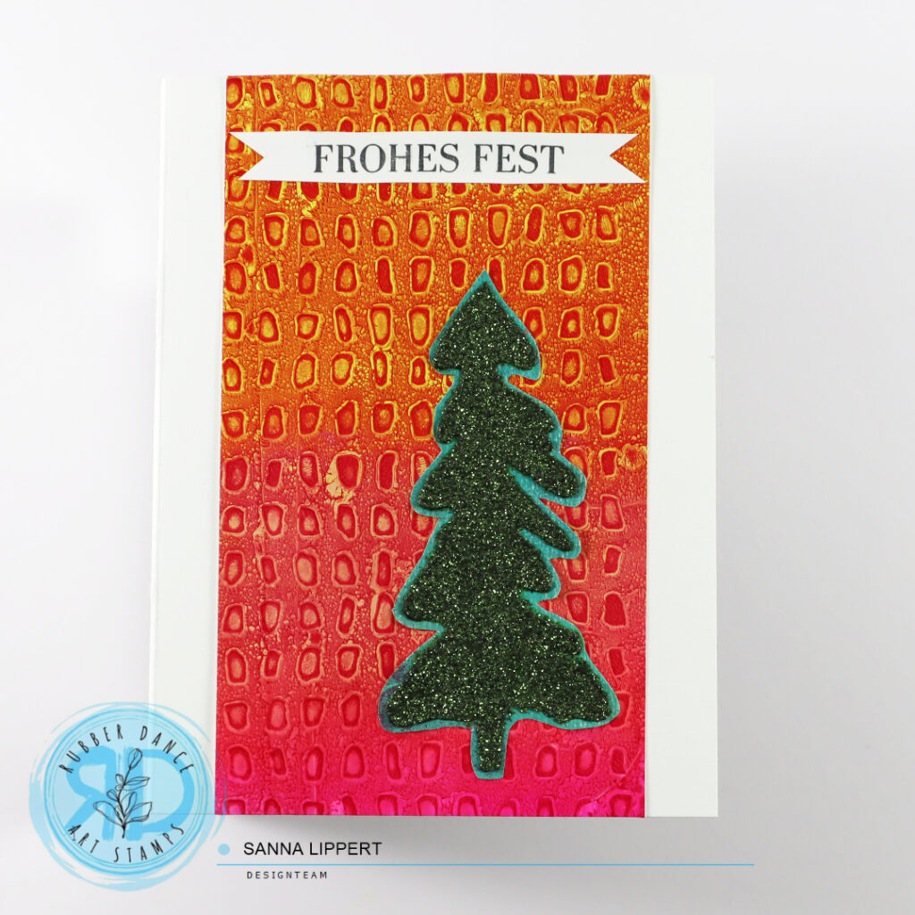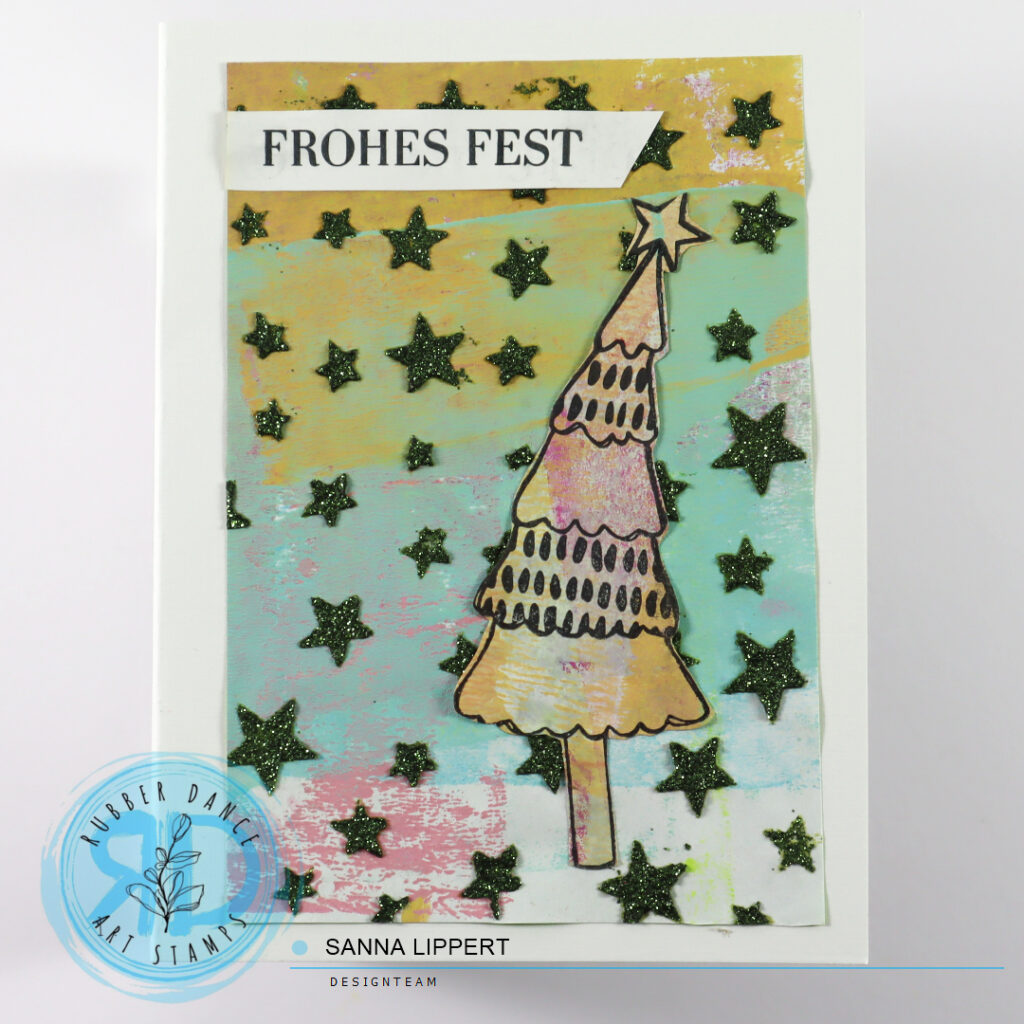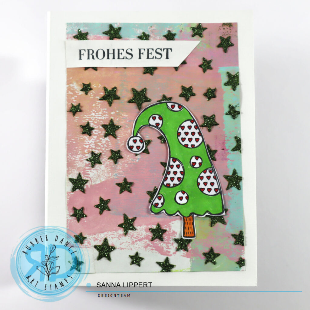 I have a glitter paste stenciled background paper on these cards (made with Tonic Studios paste and Stars 1 Rubber Dance stencil). On top I´ve added some on collage paper stamped (Textured Xmas Trees 2) trees. Finished with Kartengrüße stamp set sentiments. The green tree was stamped on plain paper and then colored with Edding glitter brush pens.