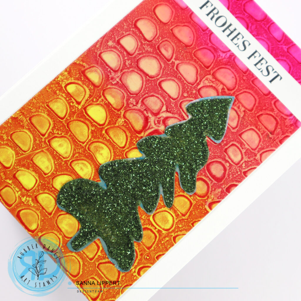 For the second set I´ve used the Marks 3 and Marks 2 stencil with a Gelli Arts gel plate for the backgrounds. On top I´ve used the Xmas Trees 1 stencil with Tonic Studios glitter paste and the sentiment is again done with Kartengrüße stamp set. I really like these bright colors! Who says Xmas cards can´t be bold in color?!
