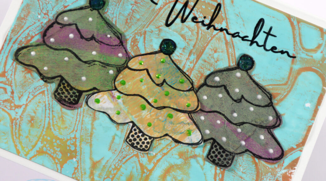And for the final set I´ve used the Organic 3 and Cross It stencil with a gel plate on the background. The trees (Textured Xmas Trees 2) got stamped onto another gelli printed collage paper and fussy cut. I´ve added some glitter pen details to the slimline card´s trees and the smaller card has some Tonic Studio Nuvo Drops as decor. Sentiments on both were stamped with the Kartengrüße stamp set.