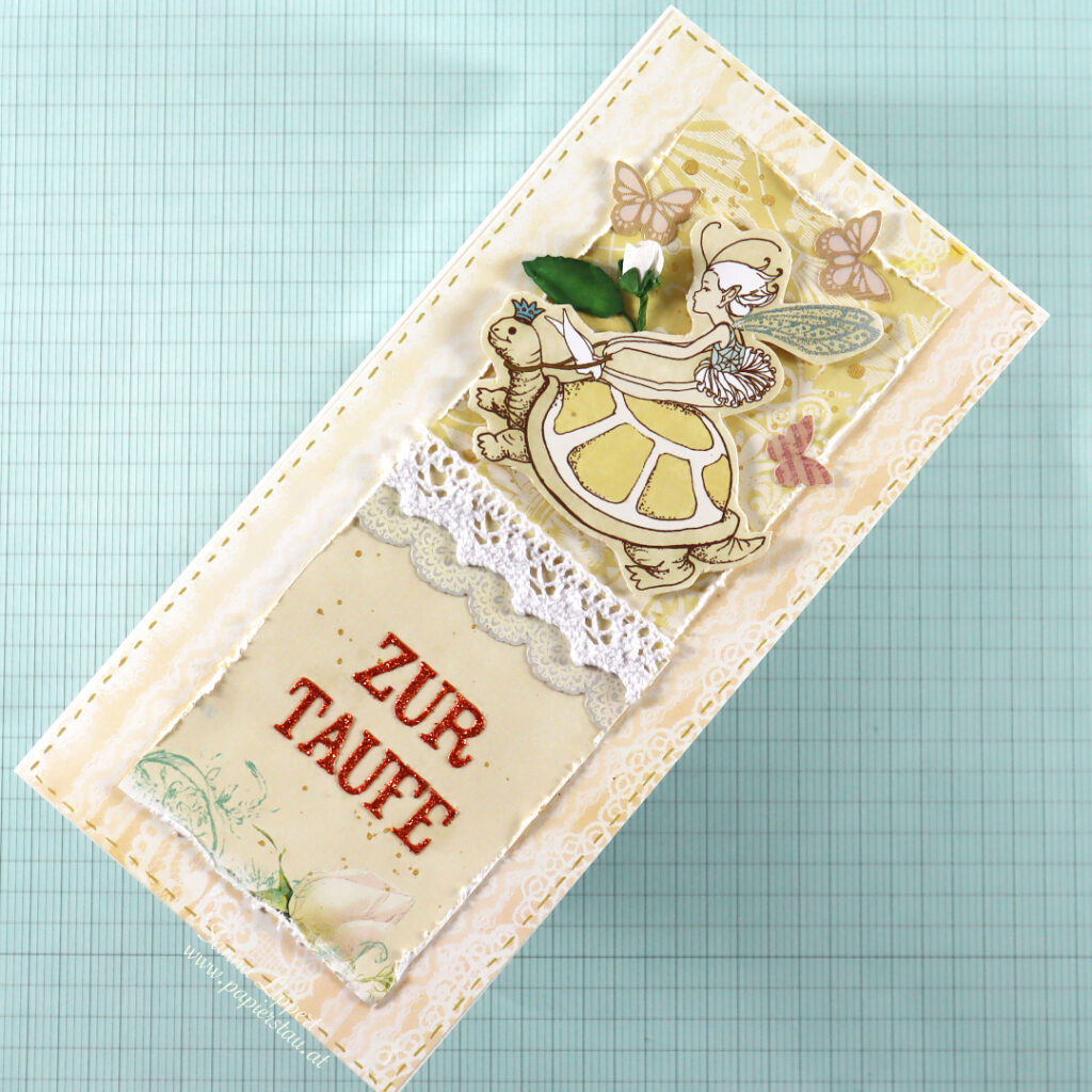 I´ve used various papers in yellow and beige tones from my paper stash. The card is for a baby girl, but it´s not supposed to be pink, thus the light yellow and beige tones.