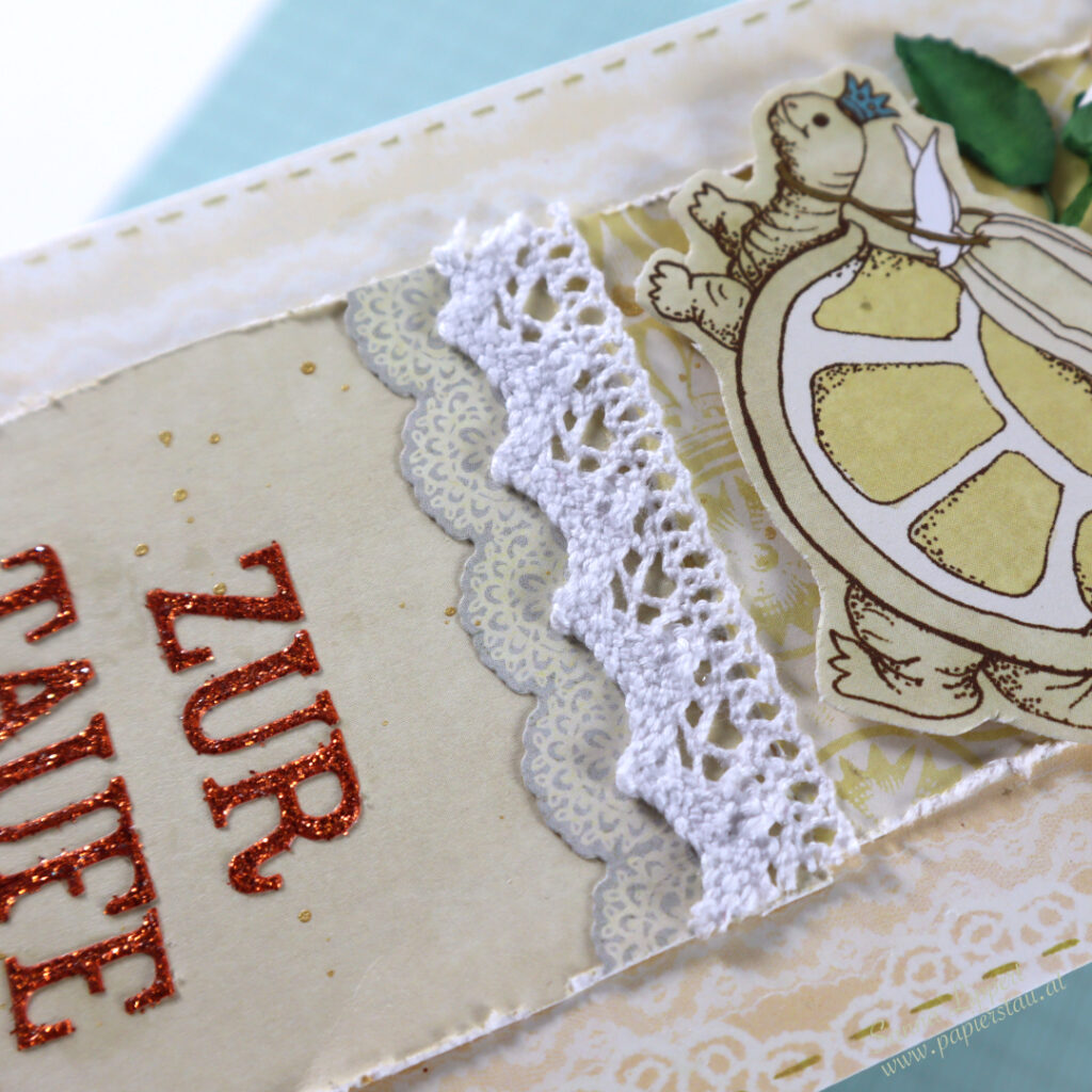 Underneath the turtle, there is some lace and a border sticker and finally some orange toned glitter alphas for the sentiment.