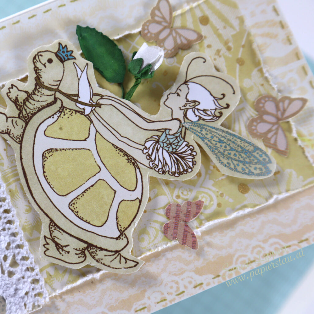 On top some more yellow toned patterned paper with distressed edges and Gansai Tambi pigment golden droplets here and there. On top a fussy cut image, adhered to the paper with 3D-foam and some sticker butterflies and a paper rose.