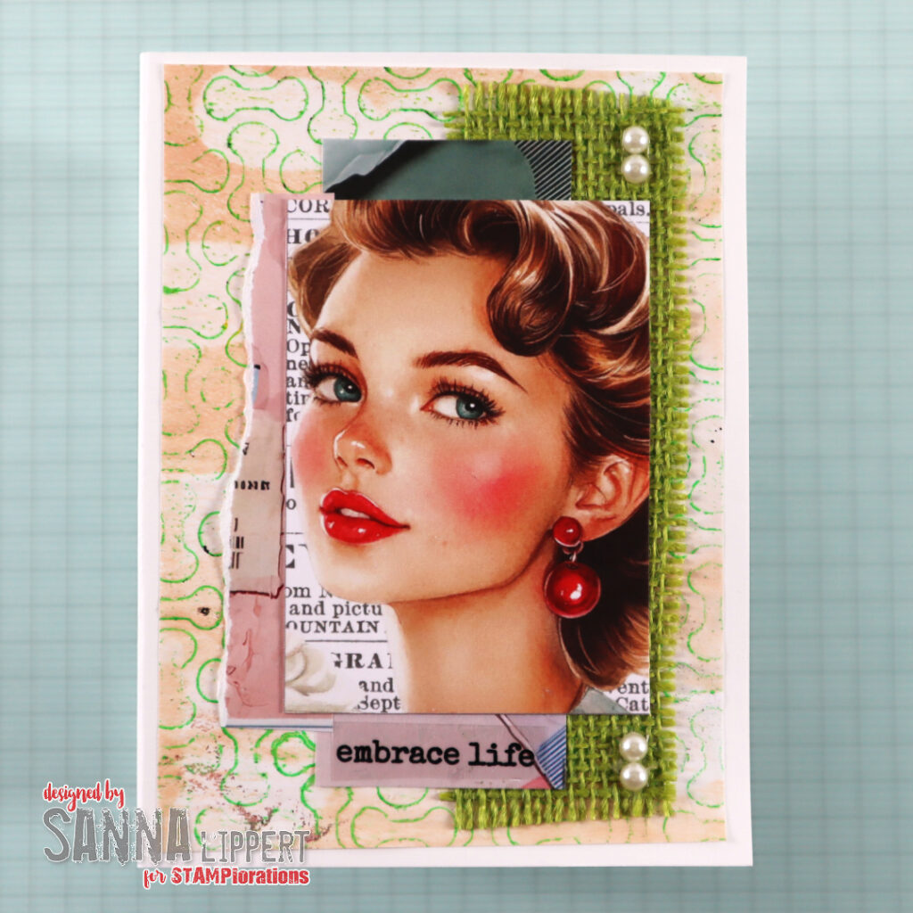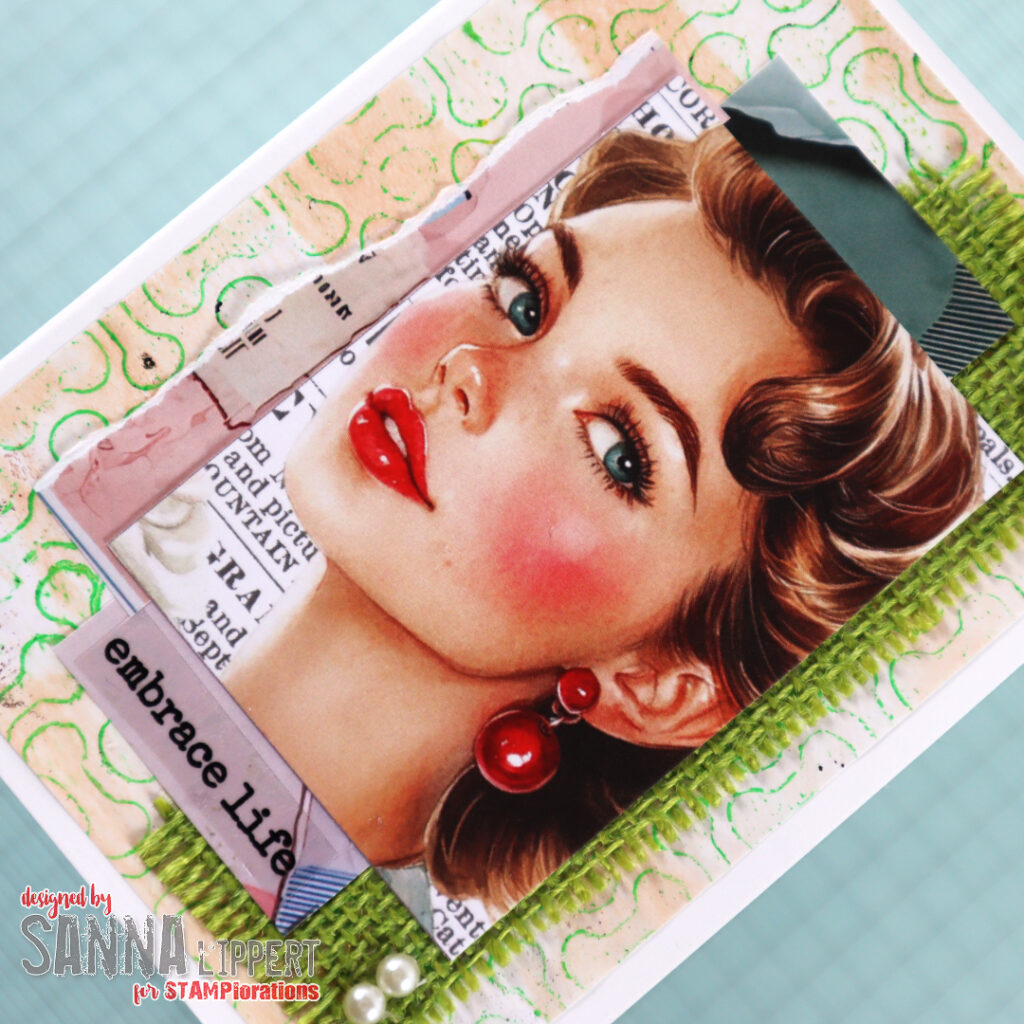For the first card I created a cluster with Ephemeral Edges collage paper, a Retro Femme ATC and some green burlap. For additional decor I used white half pearls and STAMPlorations clear stickers.
