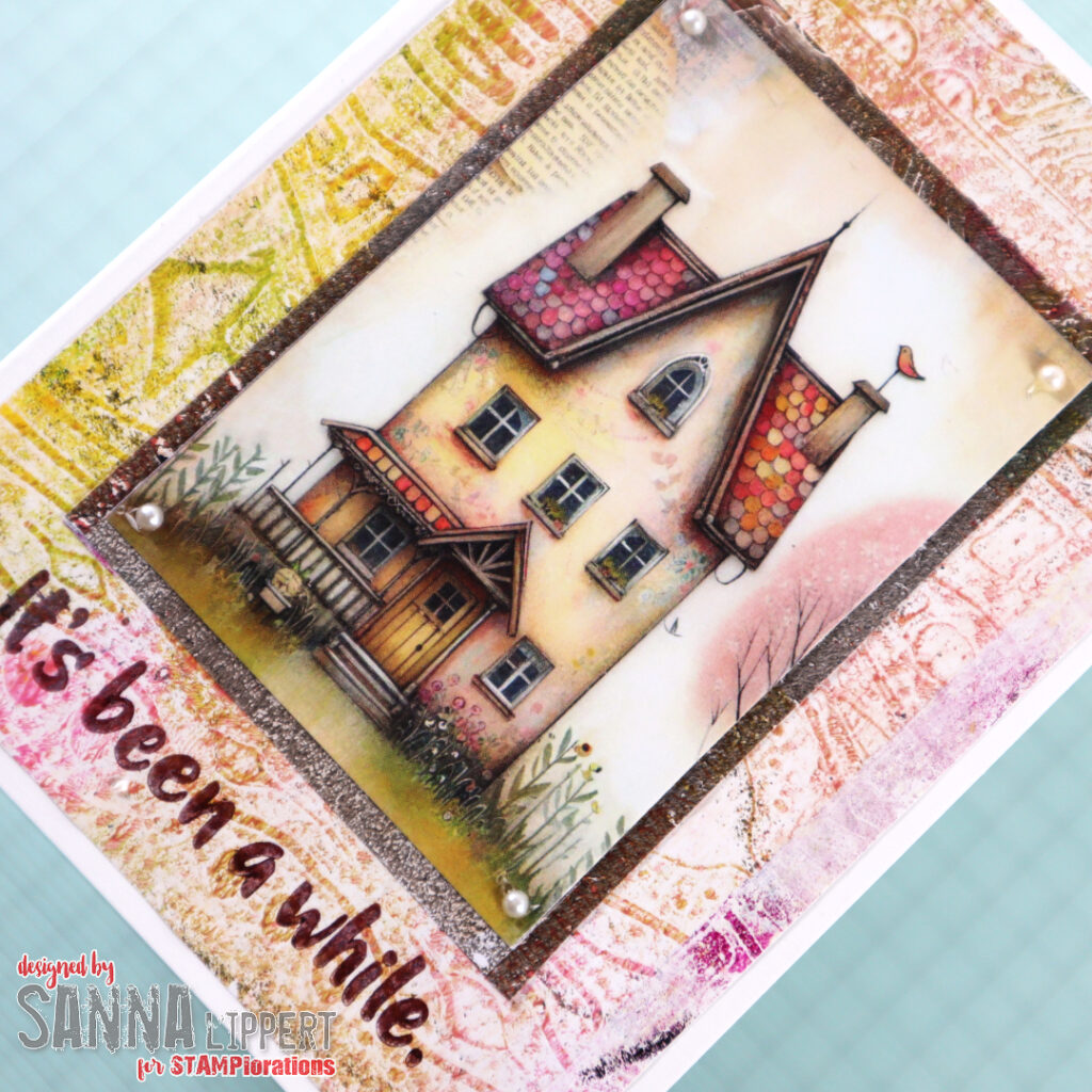 The second card also has a gelli printed collage paper background and a stamped sentiment (Hello You stamp set). As a centerpiece I used the gorgeous Whimsical Homes ATC card. Decorated with small white half pearls on each edge.