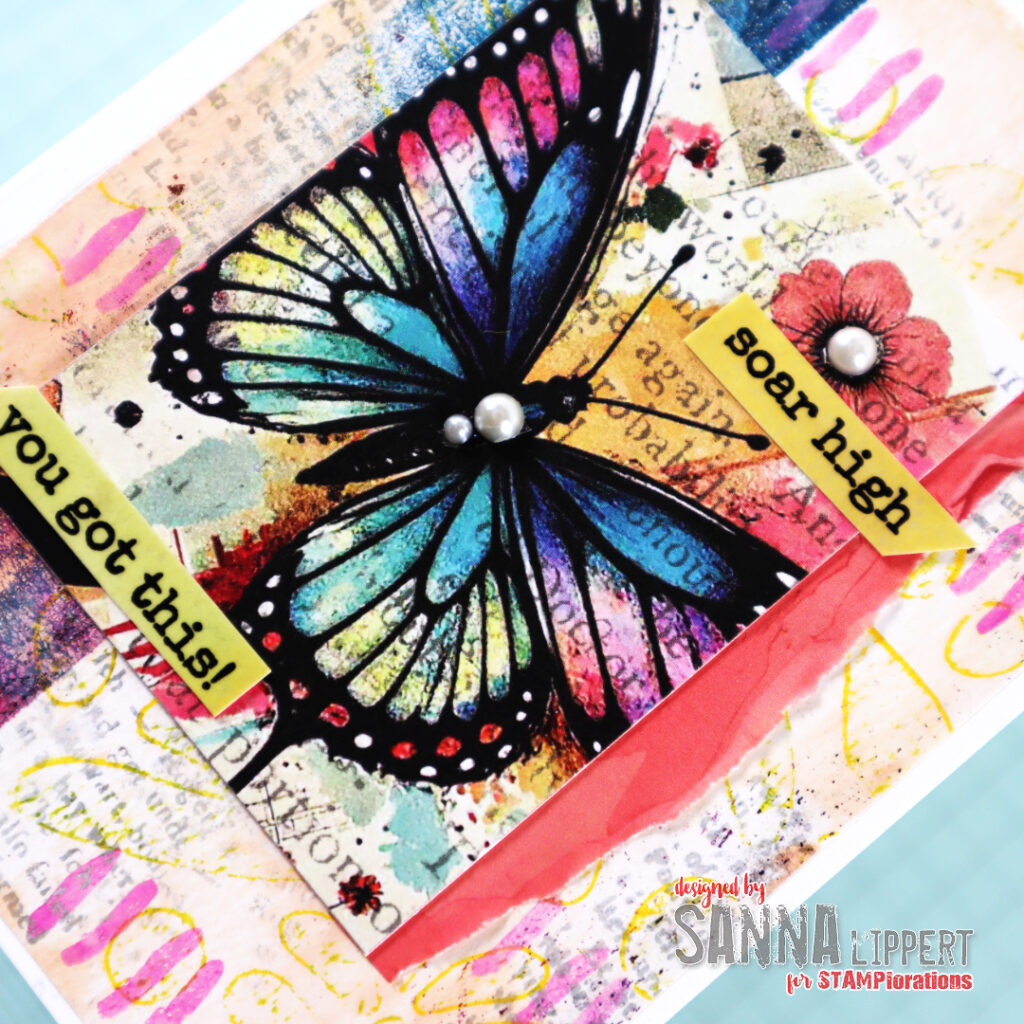 For the last card I´ve used another gelli printed collage paper as a background. As a centerpiece a Color Me Spring ATC butterfly card. I´ve also added a strip of Ephemeral Edges collage paper to the ATC and some clear stickers. As a decor element, again some white half pearls here and there. I also added some stamping to the collage paper with Distress Oxide Inks and Art Marks 3 stamp set.