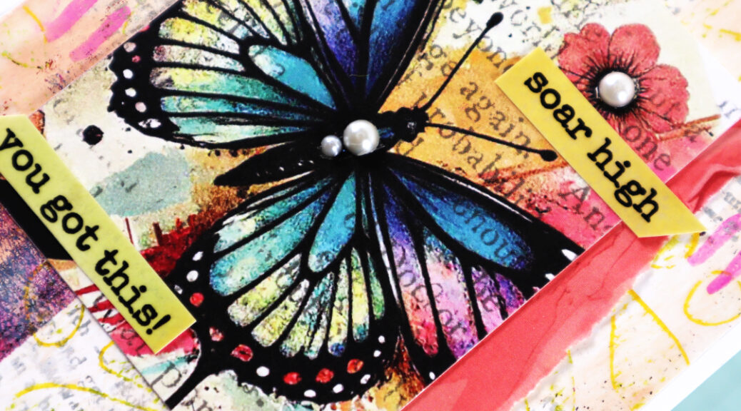 For the last card I´ve used another gelli printed collage paper as a background. As a centerpiece a Color Me Spring ATC butterfly card. I´ve also added a strip of Ephemeral Edges collage paper to the ATC and some clear stickers. As a decor element, again some white half pearls here and there. I also added some stamping to the collage paper with Distress Oxide Inks and Art Marks 3 stamp set.