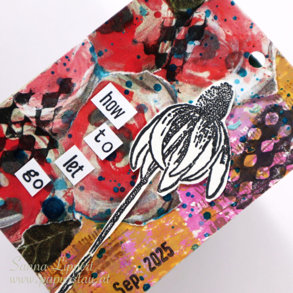 I used a paint residue paper (on the right side) as my carry-over-item from the previous deck card. My constant is a date stamp. On the left side I used a collage paper gifted to me by Yuna from Australia. I used the flowers as a background detail. On top I added some Rubber Dance Mix It Up 5 stamp set stamping.
