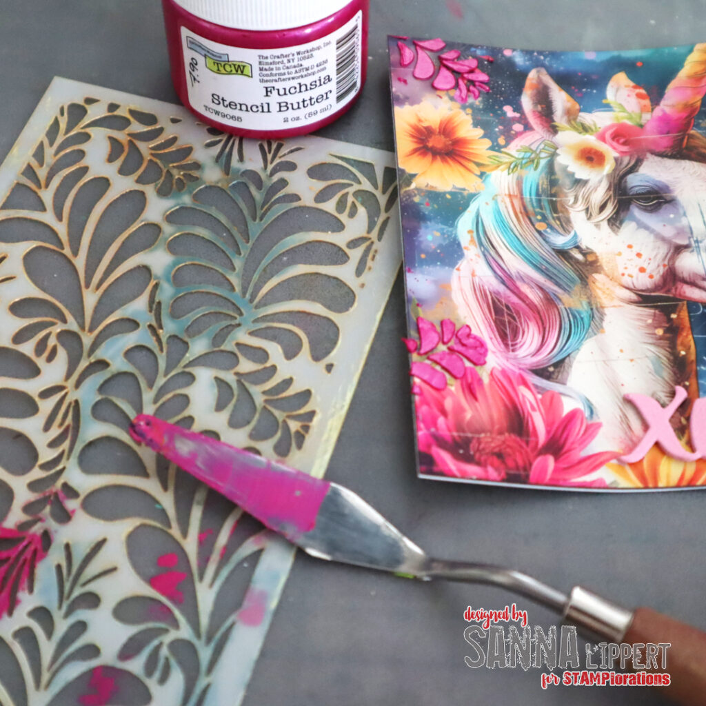 For the first card I used the STAMPlorations “Flair” stencil with TCW Fuchsia stencil butter and the STAMPlorations “xoxo” die cut die. I also added a STAMPlorations “New Day” clear sticker and some Gansai Tambi golden pigment droplets. The die cut sentiment is layered in 4 layers to make it stand out more from the card base.