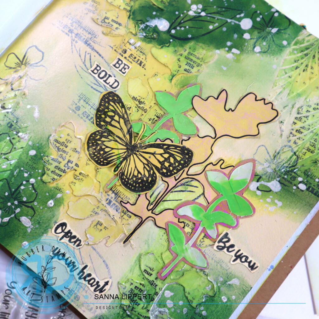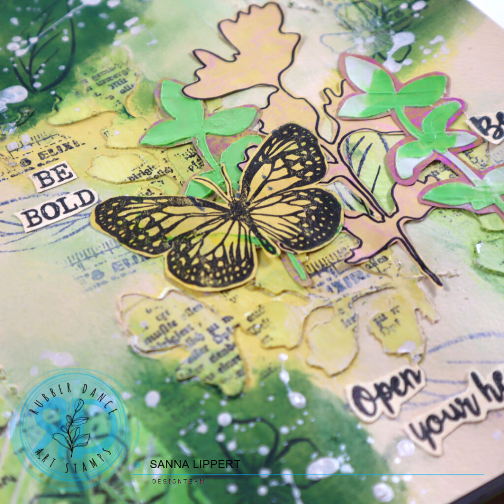 After applying the paint, I used golden pigments to add droplets to the darker areas. Finally, I created a cluster with stenciled and pasted fussy cut leaves and a Butterflies and Moths butterfly. For finishing touches I added some stamped words using the Mixed Sentiments 1 stamp set.