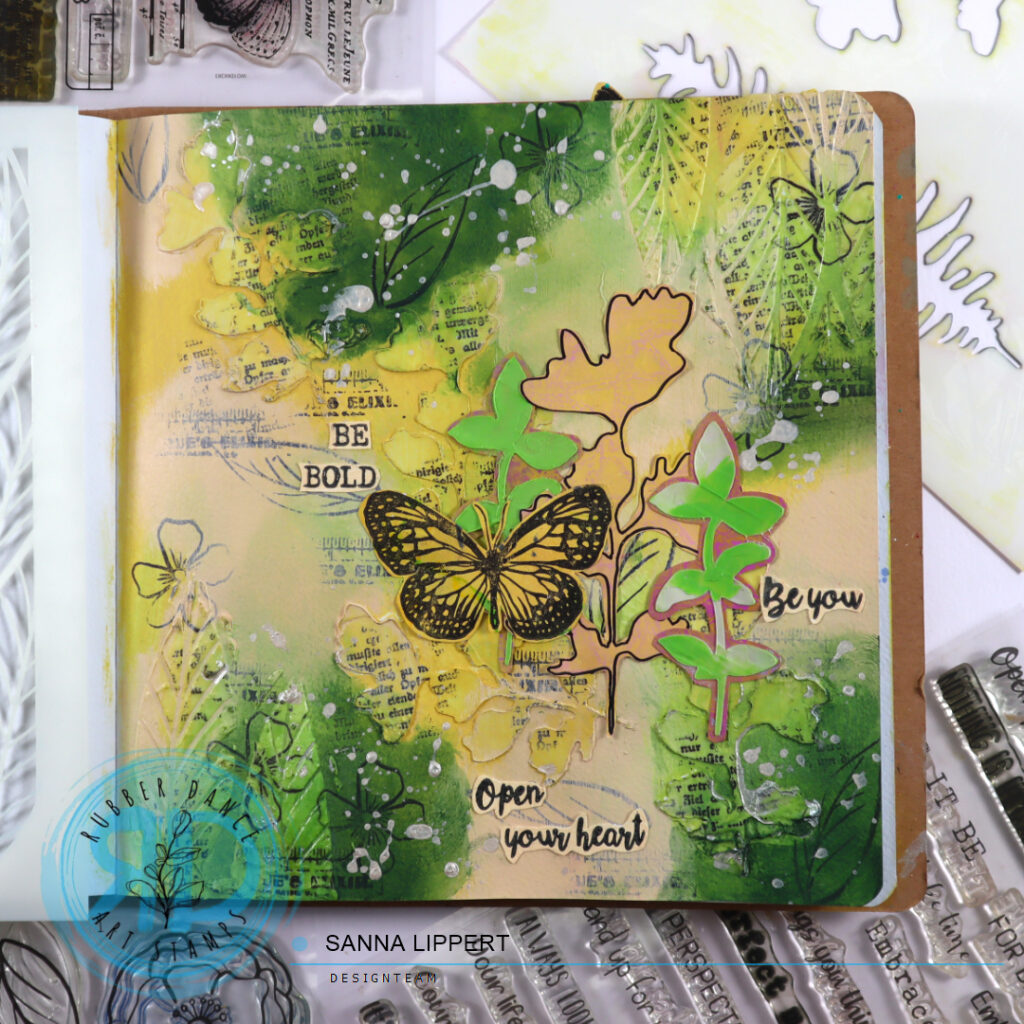 Hello, I am sharing an art journal page with a process video today. For this page I used the Sketchy Leaves 5 and Leaves 2 stencils and Loose Florals 2024, Mix It Up 5, Mixed Sentiments 1 and Butterflies and Moths stamp sets.
