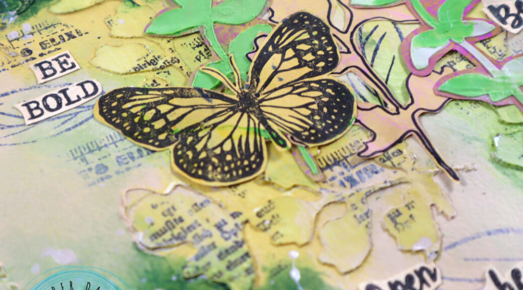 After applying the paint, I used golden pigments to add droplets to the darker areas. Finally, I created a cluster with stenciled and pasted fussy cut leaves and a Butterflies and Moths butterfly. For finishing touches I added some stamped words using the Mixed Sentiments 1 stamp set.