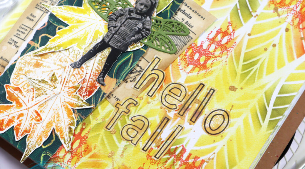 I started with the Leaves 2 stencil and Distress Inks in peeled paint, mustard seed, ripe persimmon and forest moss. I placed the stencil onto the page and started by adding the yellow ink tone. Then I took the other ink pads and brushed just tiny areas with them. I then flipped the stencil over and continued with the pattern (my page is bigger than the stencil) in the same way. After that I added some yellow to the background with a blending brush. Next I added stamped elements with the Mix It Up 7 stamp set.