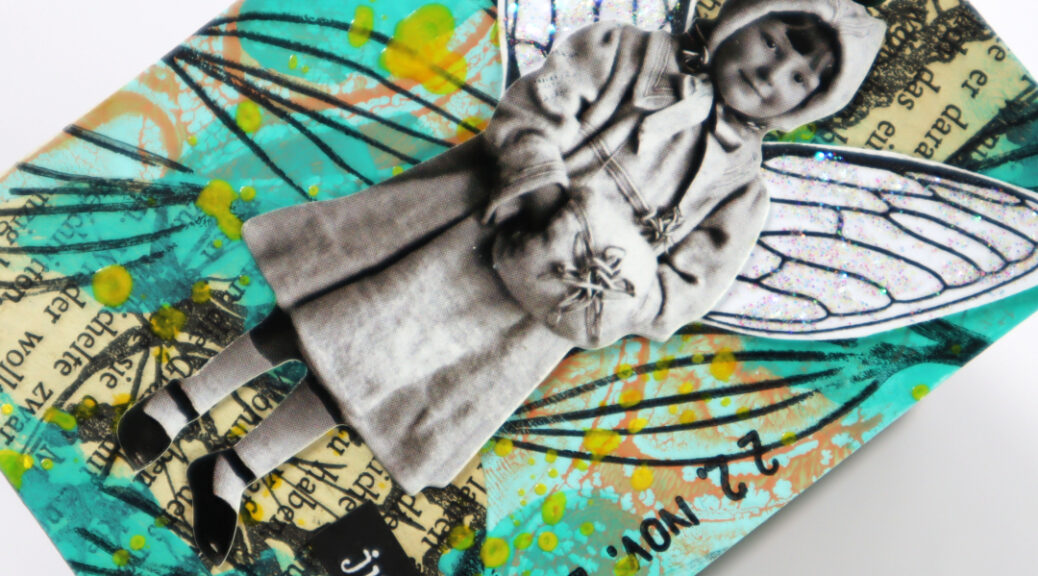 I also tuck a DIY vintage ticket (see video here) under the collage paper to create a cluster. On top of it all I added a Tim Holtz paper doll with dragonfly wings. I stamped the title with A to Z stamp set onto a paint residue paper and fussy cut the letters with scissors.