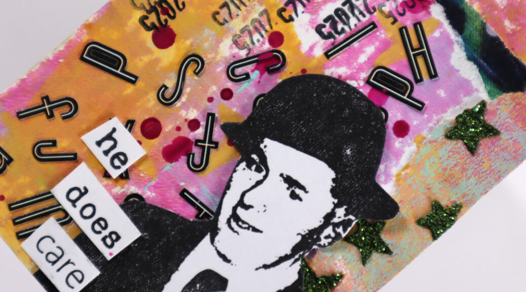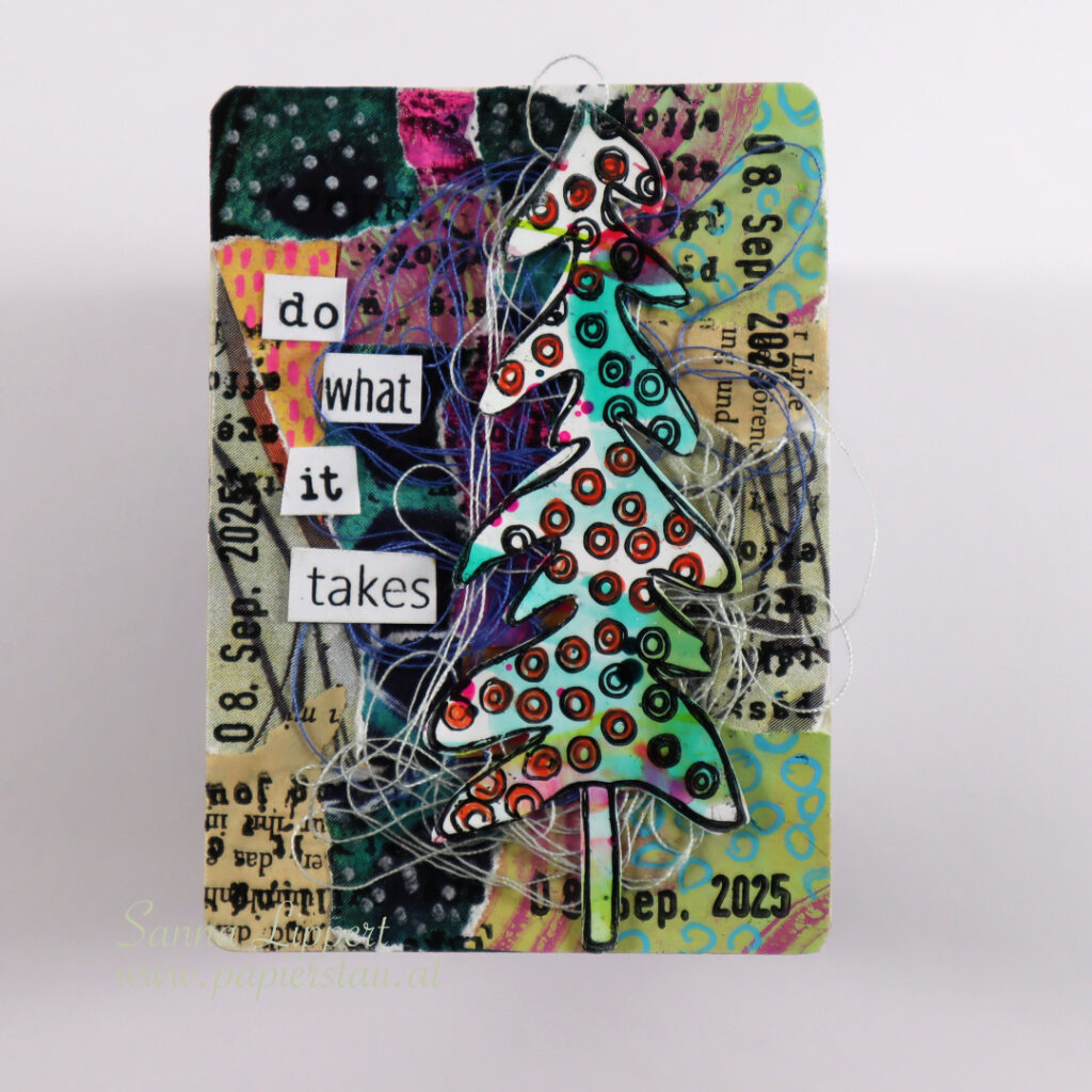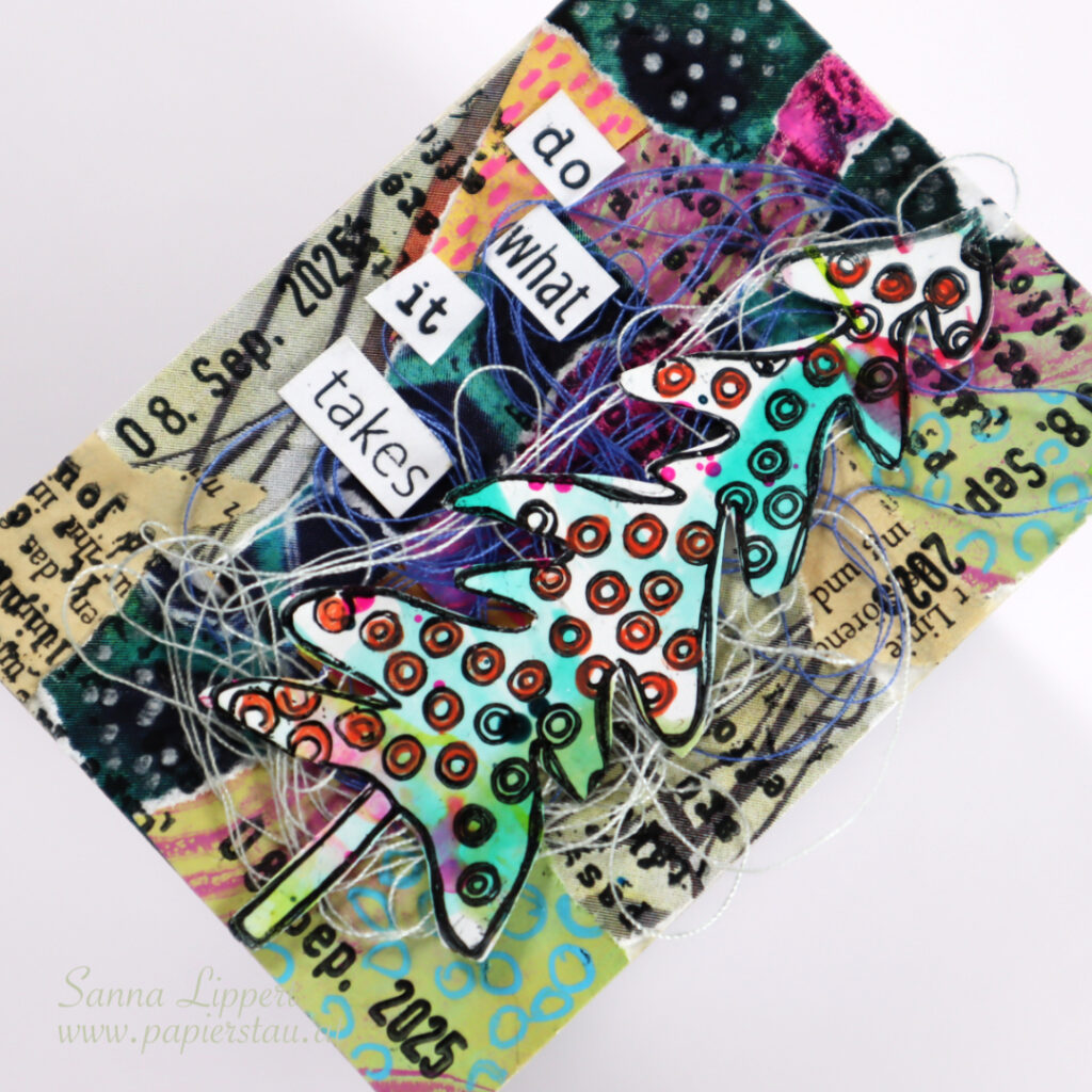 I used a paint residue paper (on the right side) as my carry-over-item from the previous deck card. My constant is a date stamp. On the left side I used a collage paper gifted to me by Yuna from Australia. I used the flowers as a background detail. On top I added some Rubber Dance Mix It Up 5 stamp set stamping.