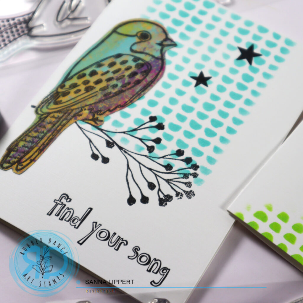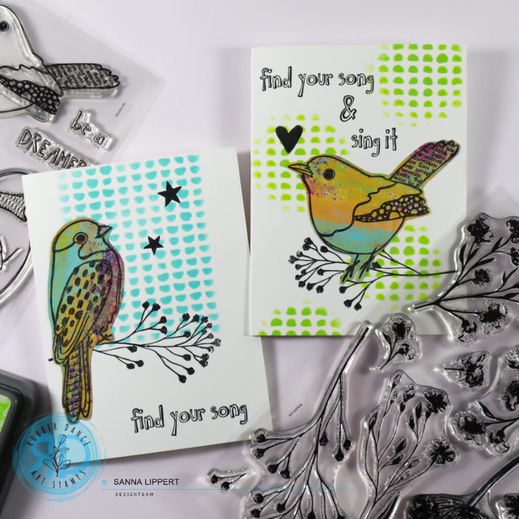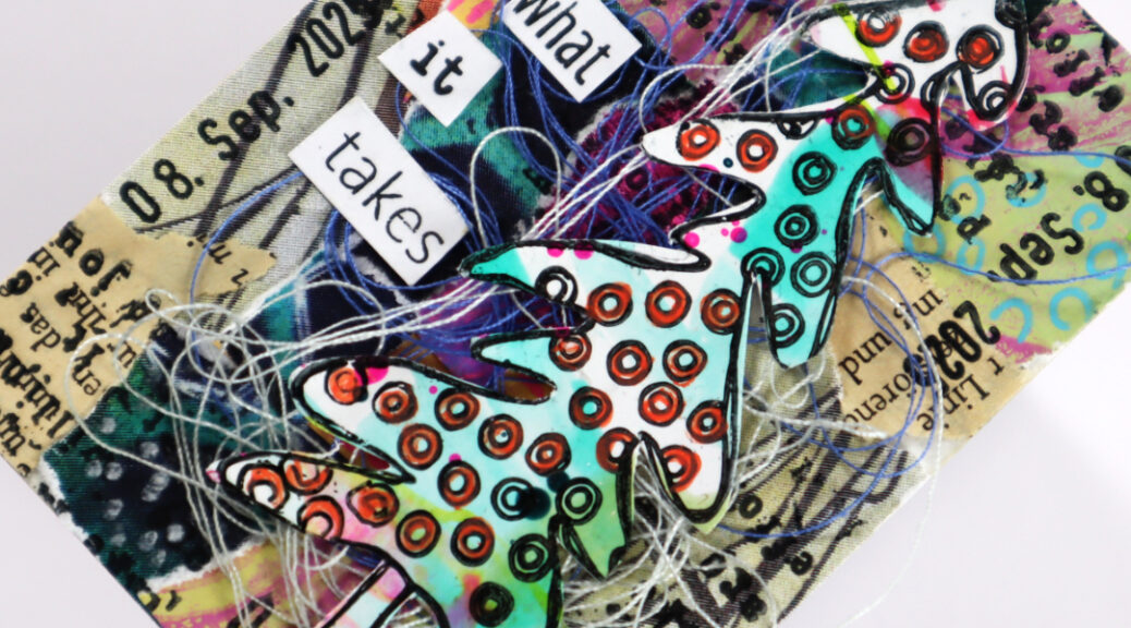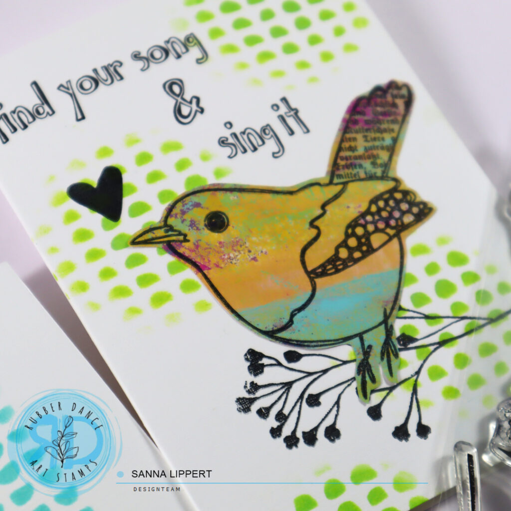 I used a paint residue paper (on the right side) as my carry-over-item from the previous deck card. My constant is a date stamp. On the left side I used a collage paper gifted to me by Yuna from Australia. I used the flowers as a background detail. On top I added some Rubber Dance Mix It Up 5 stamp set stamping.