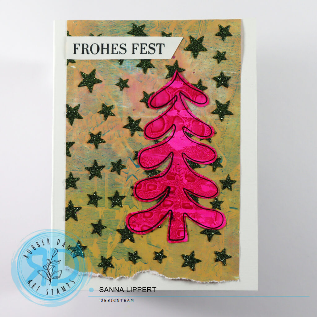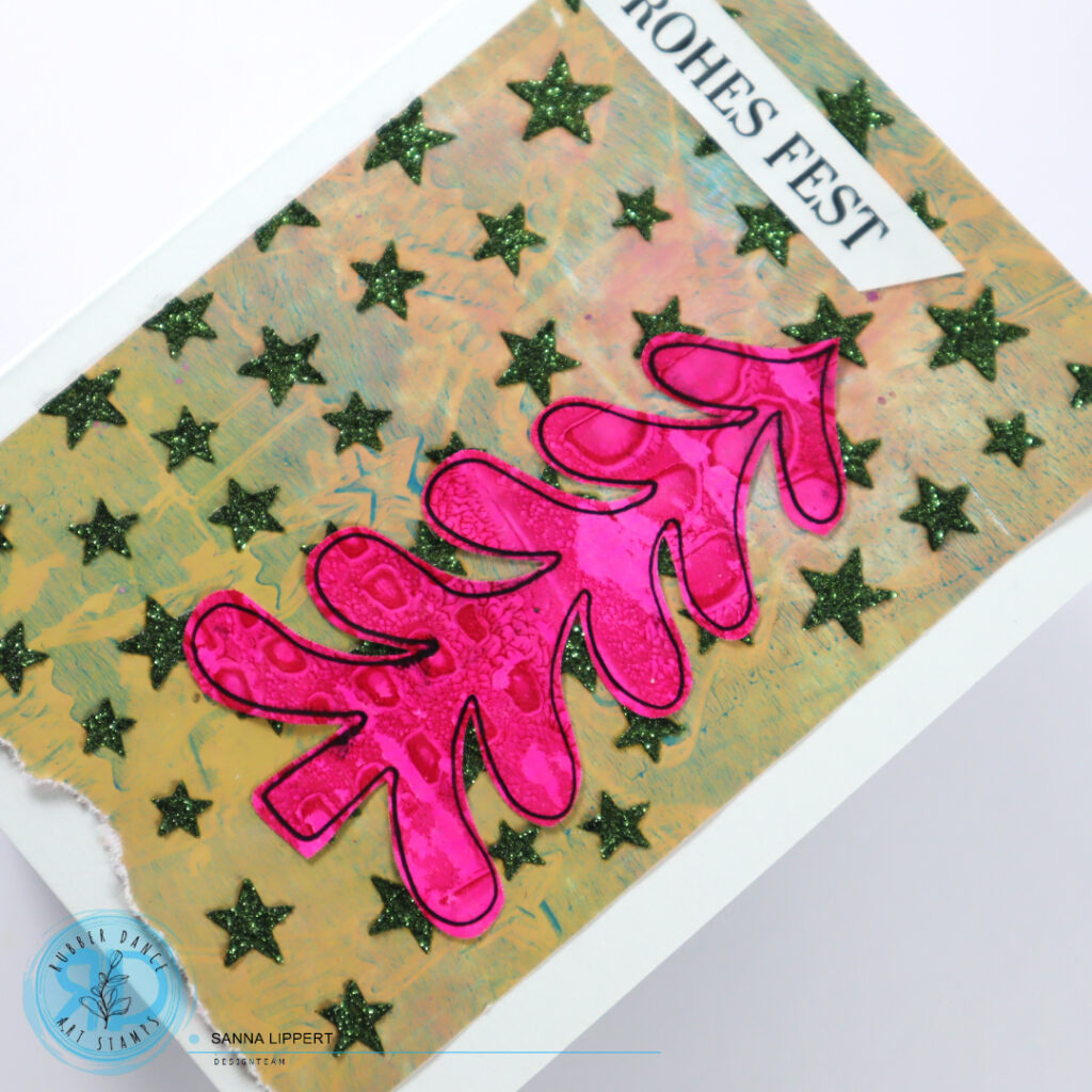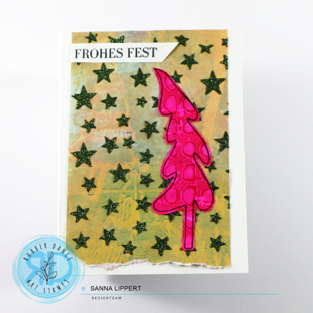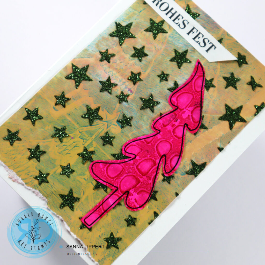 I have quite a pile of collage papers that I´ve created with Rubber Dance stamps and stencils during the past year. This pile is a great starting point to any kind of project, basically. Here I´ve used gelli printed images that I created using the Textured Xmas Trees 2 stamp set. Next I took a glitter paste and applied it thru the Stars 1 stencil onto the paper.