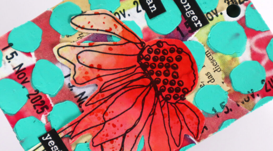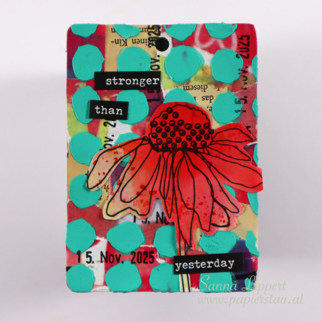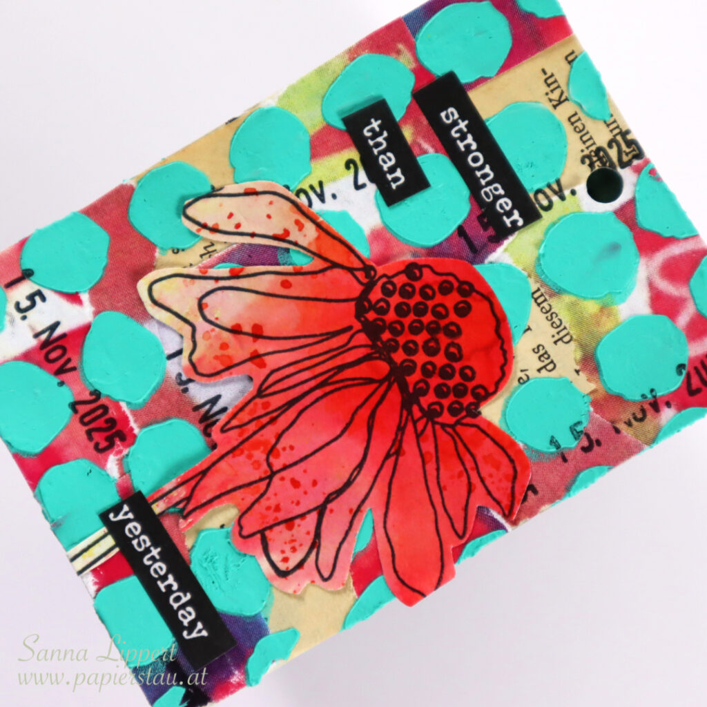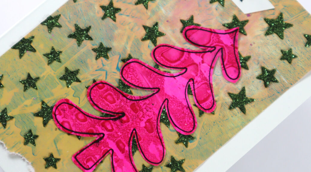 I have quite a pile of collage papers that I´ve created with Rubber Dance stamps and stencils during the past year. This pile is a great starting point to any kind of project, basically. Here I´ve used gelli printed images that I created using the Textured Xmas Trees 2 stamp set. Next I took a glitter paste and applied it thru the Stars 1 stencil onto the paper.