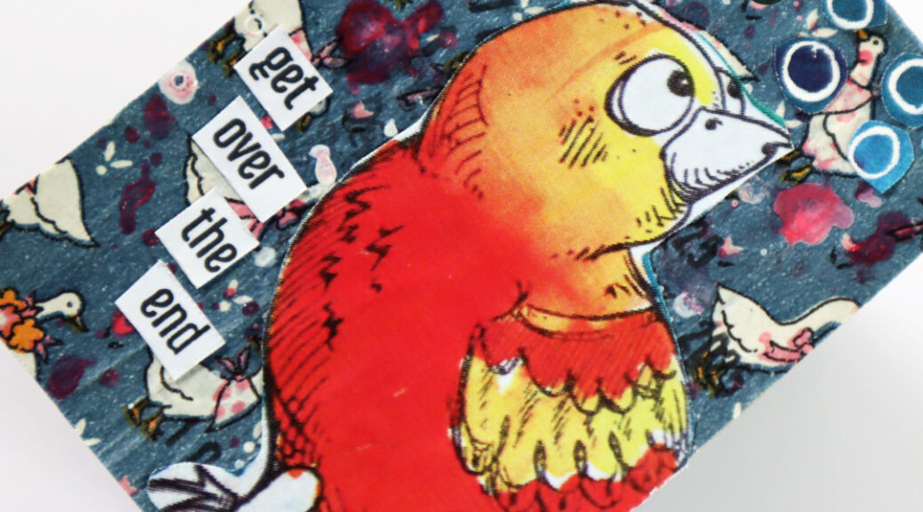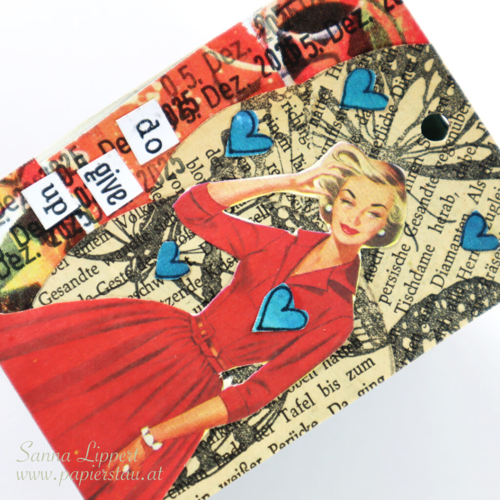 On top some Dina Wakley Gloss Sprays and my constant, a date stamp. My focal point is a big birdie, adding to the bird theme there. The stamped words are from a Rubber Dance stamp set. For finishing touches I added some hand drawn white circles. Drawn on the same blue paper I used on my previous deck card for the hearts. So also ticked off the carry over theme there, too.