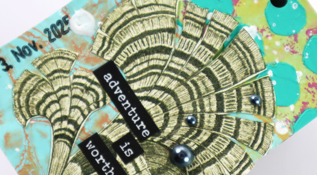 Here is one more bonus card, for which I just added some stenciling with the Ornament 1 stencil as a background and arranged some collage paper trees on top. I had some left over and didn´t want them to go to waste.