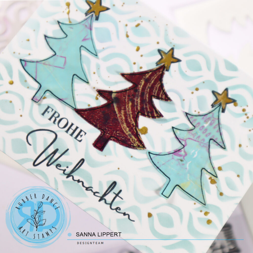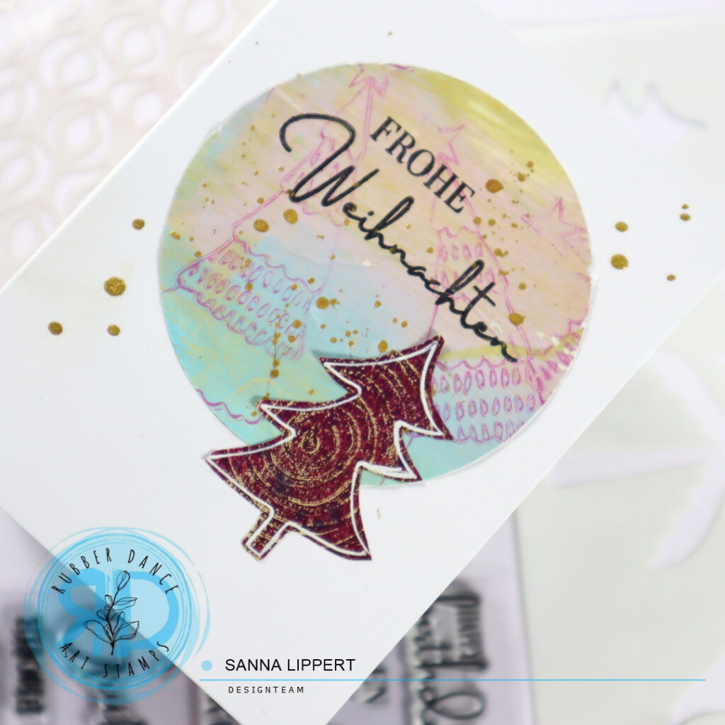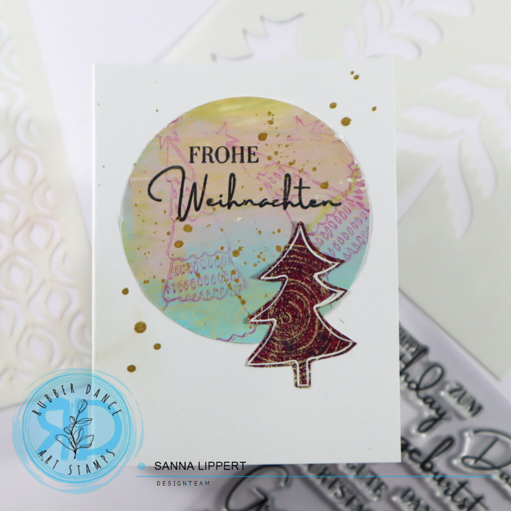 I basically combined the ideas from my previously shared Christmas cards here. I die cut the collage paper with the Textured Xmas Trees 2 pattern on it with circle die cut dies. And the Mix It Up 4 set circle stamp patterned paper is traced thru the Xmas Trees 2 stencil and then fussy cut. I then adhered both pieces to a white card base, added a sentiment stamp with the Kartengrüße stamp set and some golden pigment droplets here and there.
