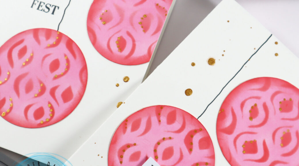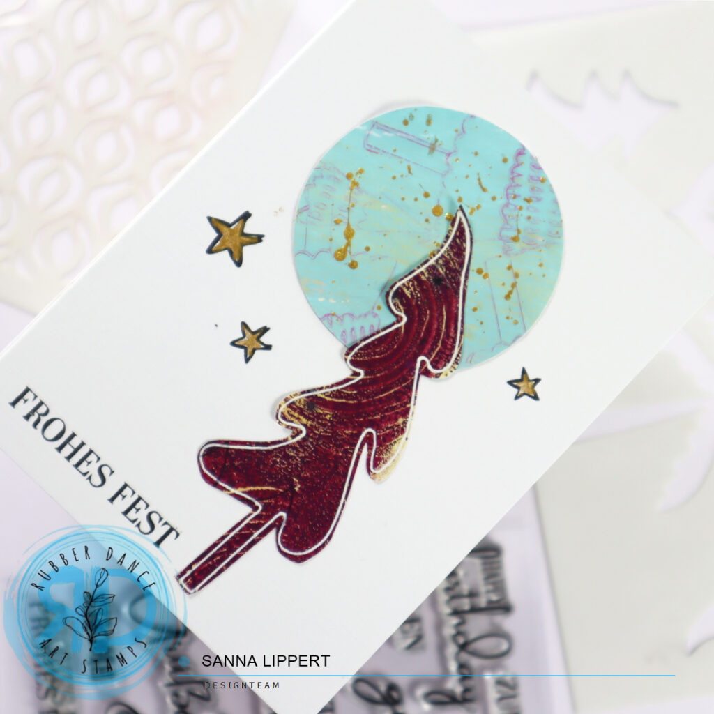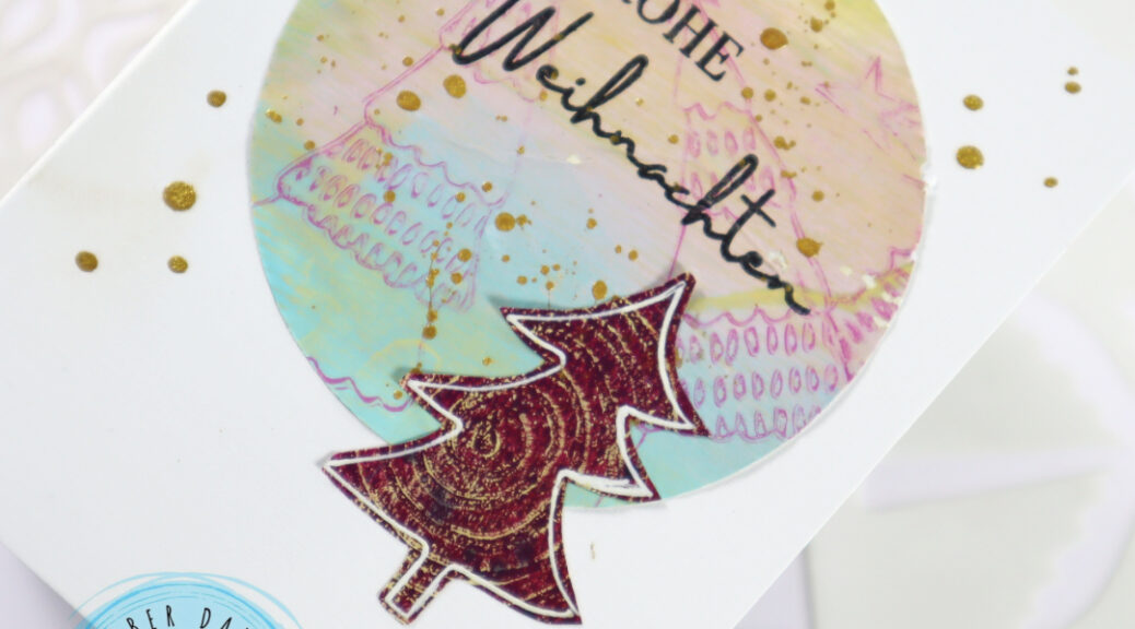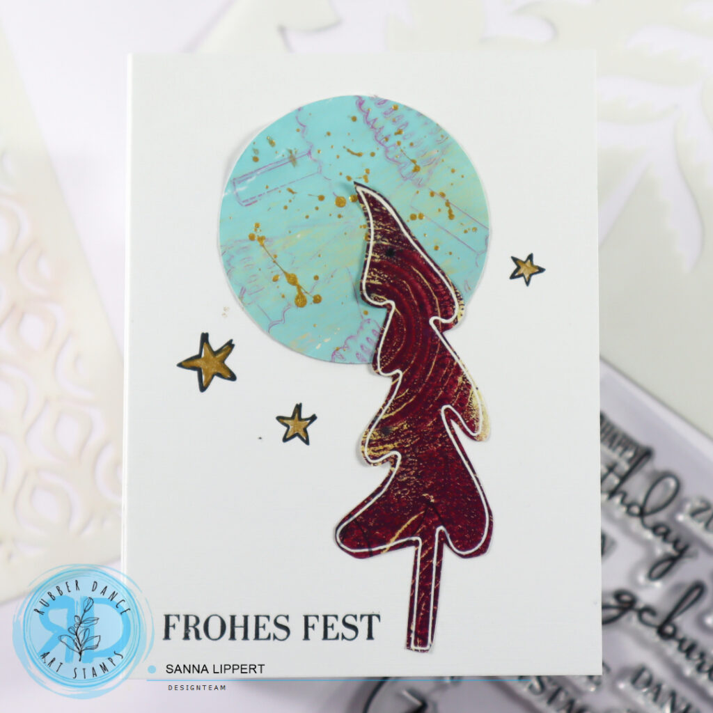 I basically combined the ideas from my previously shared Christmas cards here. I die cut the collage paper with the Textured Xmas Trees 2 pattern on it with circle die cut dies. And the Mix It Up 4 set circle stamp patterned paper is traced thru the Xmas Trees 2 stencil and then fussy cut. I then adhered both pieces to a white card base, added a sentiment stamp with the Kartengrüße stamp set and some golden pigment droplets here and there.