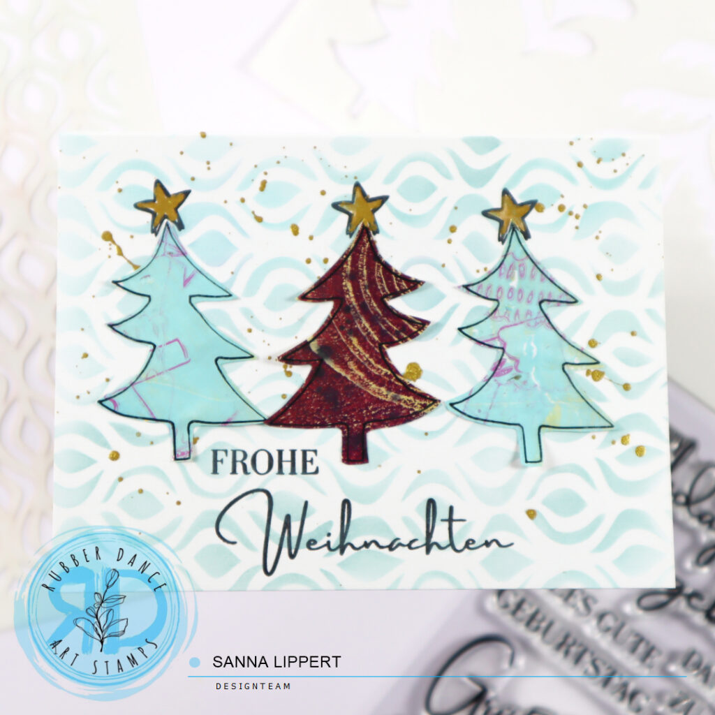 Hello, I am up over at the Rubber Dance blog again today with another clean and simple card Christmas card share. For these cards I used some gelli printed collage papers, the Xmas Trees 2 stencil and the Kartengrüße stamp set. For the collage paper I had used the Textured Xmas Trees 2 and the Mix It Up 4 stamp set.
