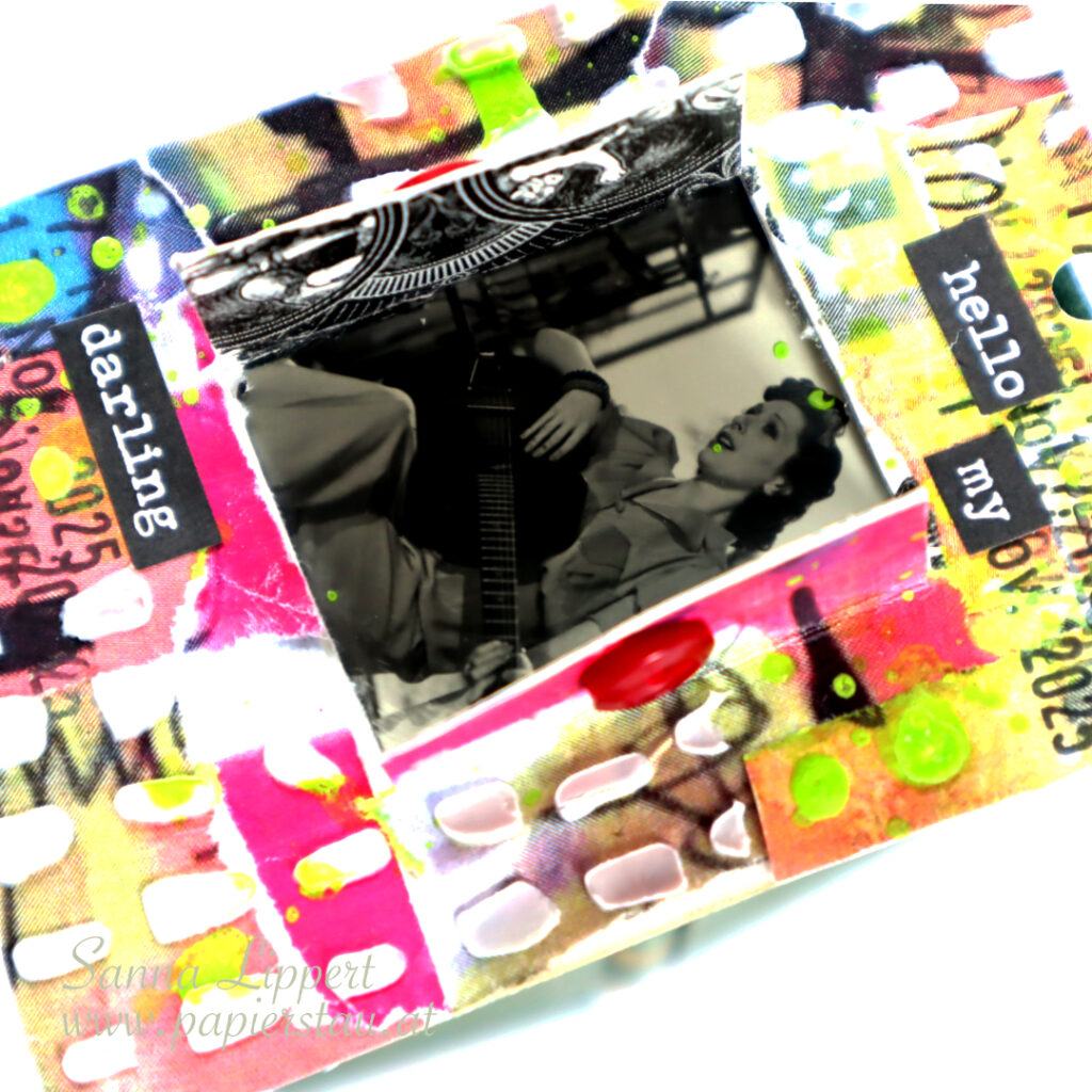 I used an exacto knife to cut a window onto the deck card. I then placed a vintage photo behind the window. After that I added some of the collage papers that I also used on my previous deck card (carry-over-item) and added some additional ones. All gifted to me by Yuna from Australia.