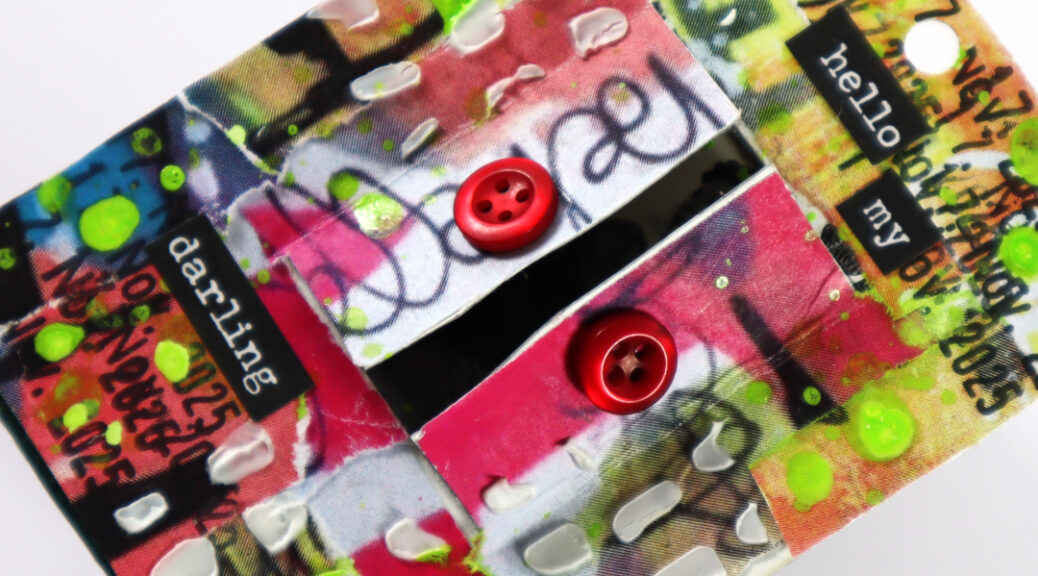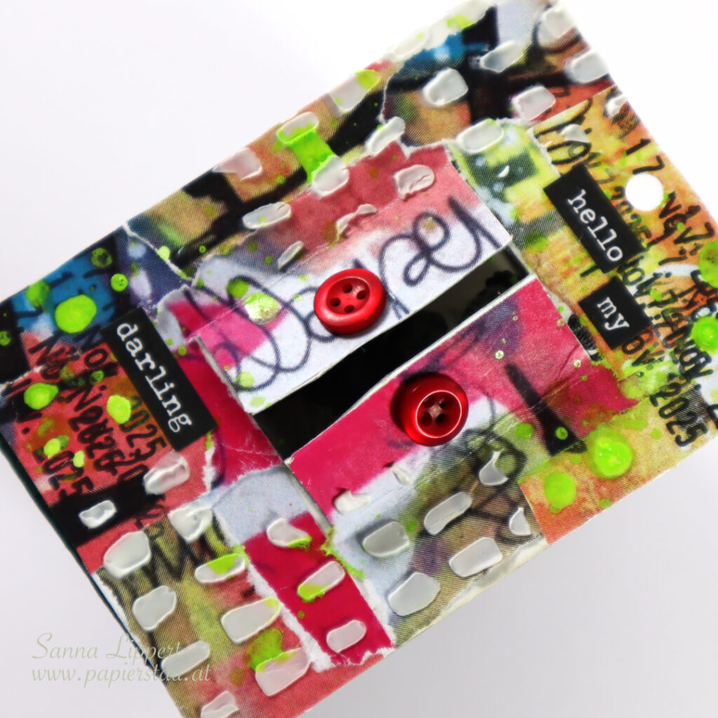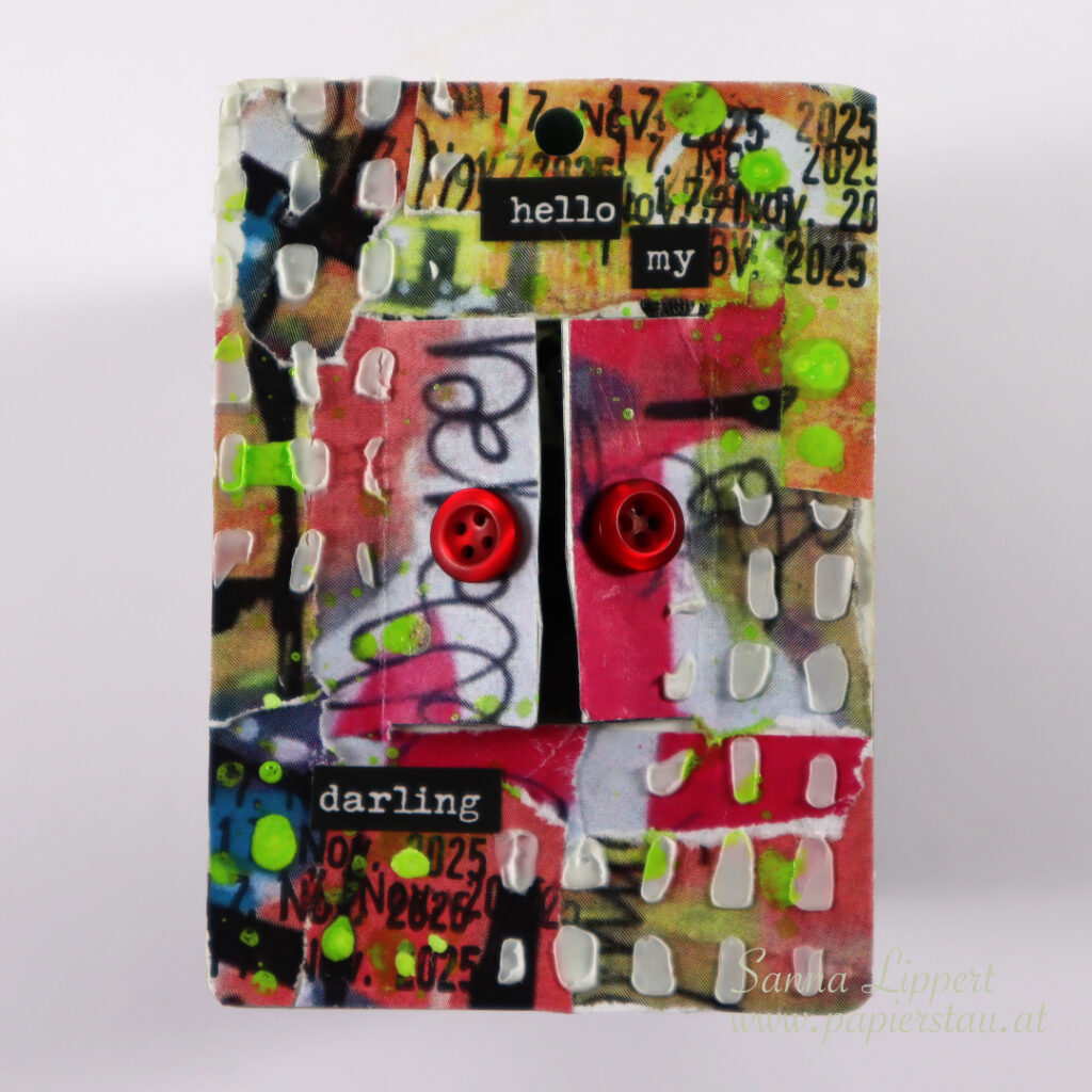 After adhering the collage papers on place, I added my constant, a date stamp here and there. After that some white modeling paste thru a Rubber Dance stencil. After that some Dina Wakley Gloss Spray as detail.